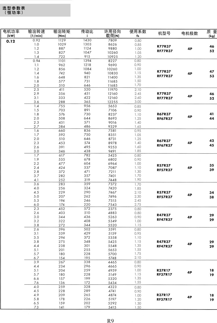 R系列选型参数表