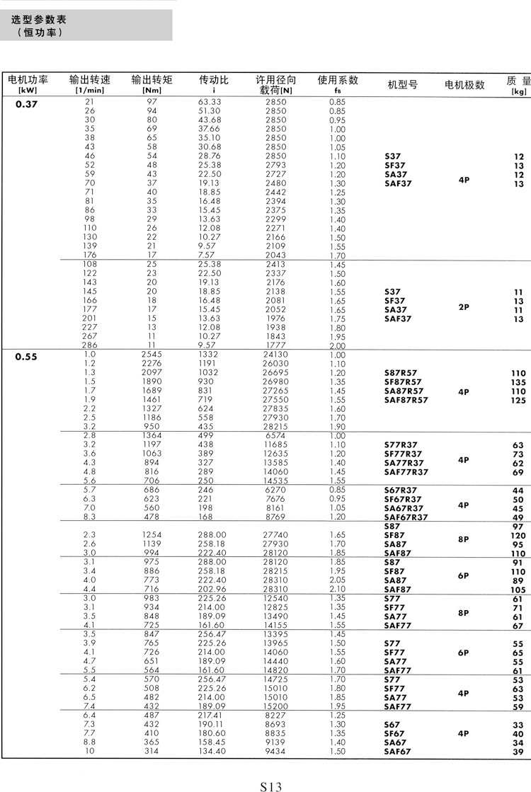 S系列选型参数表