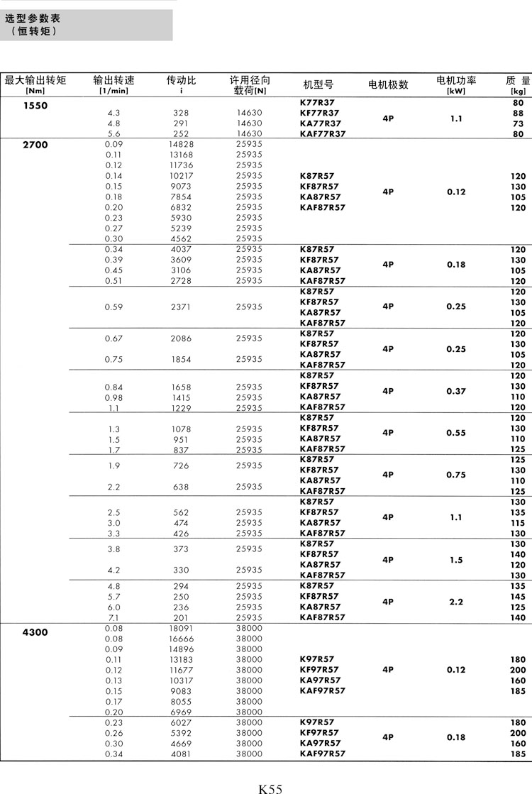 K系列选型参数表