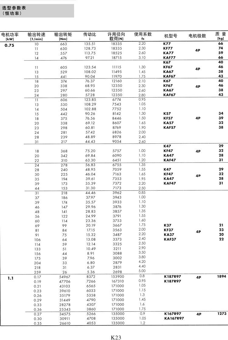 K系列选型参数表