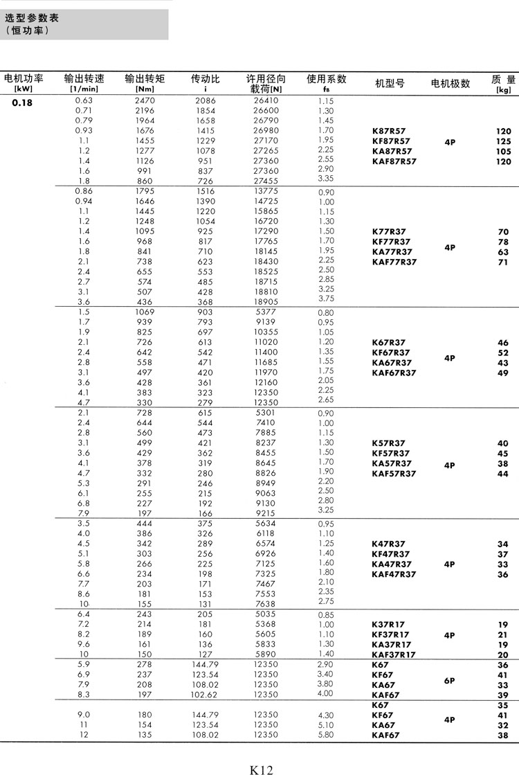 K系列选型参数表